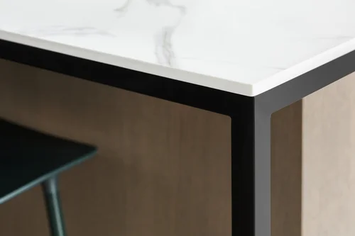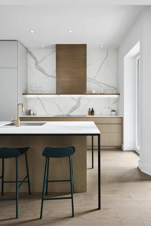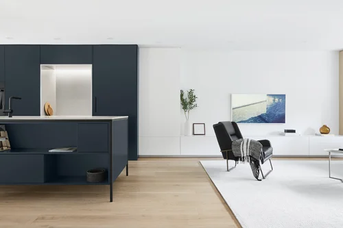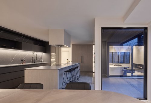 Black Fenix was selected as the primary material for all interior millwork, featuring a sleek matte finish that beautifully contrasts the warmth of natural wood elements and the organic patterns found in the porcelain tiles installed throughout the residence.